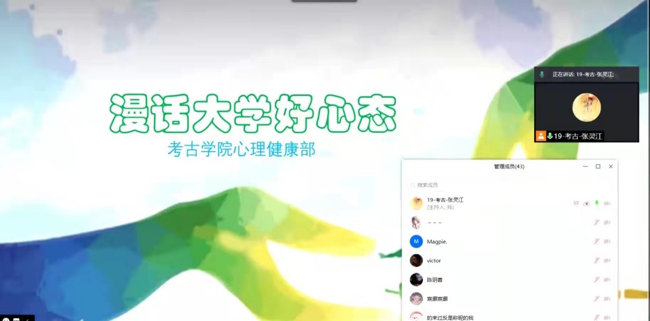 2021年9月17日下午,太陽成集團tyc151cc心理健康部面向2021級新生開展了“漫話大學好心態(tài)”主題云活動。本次活動的主要目的在于向廣大新生宣傳心理健康知識,引導(dǎo)和幫助新生做好學業(yè)規(guī)劃,培養(yǎng)新生樹立起自信自立、樂觀向上、奮發(fā)有為的精神品格,為即將開啟的大學新生活做好心理準備?;顒友埩?8級考古專業(yè)田玉峰、19級考古專業(yè)溫景超、19級文博專業(yè)賴琳、20級考古專業(yè)薛雯心和湯穎欣共五位發(fā)言人,分別就大學期間的學習感悟與良好心態(tài)養(yǎng)成等問題進行了經(jīng)驗分享。2021級部分新生同學參加了此次線上交流會。