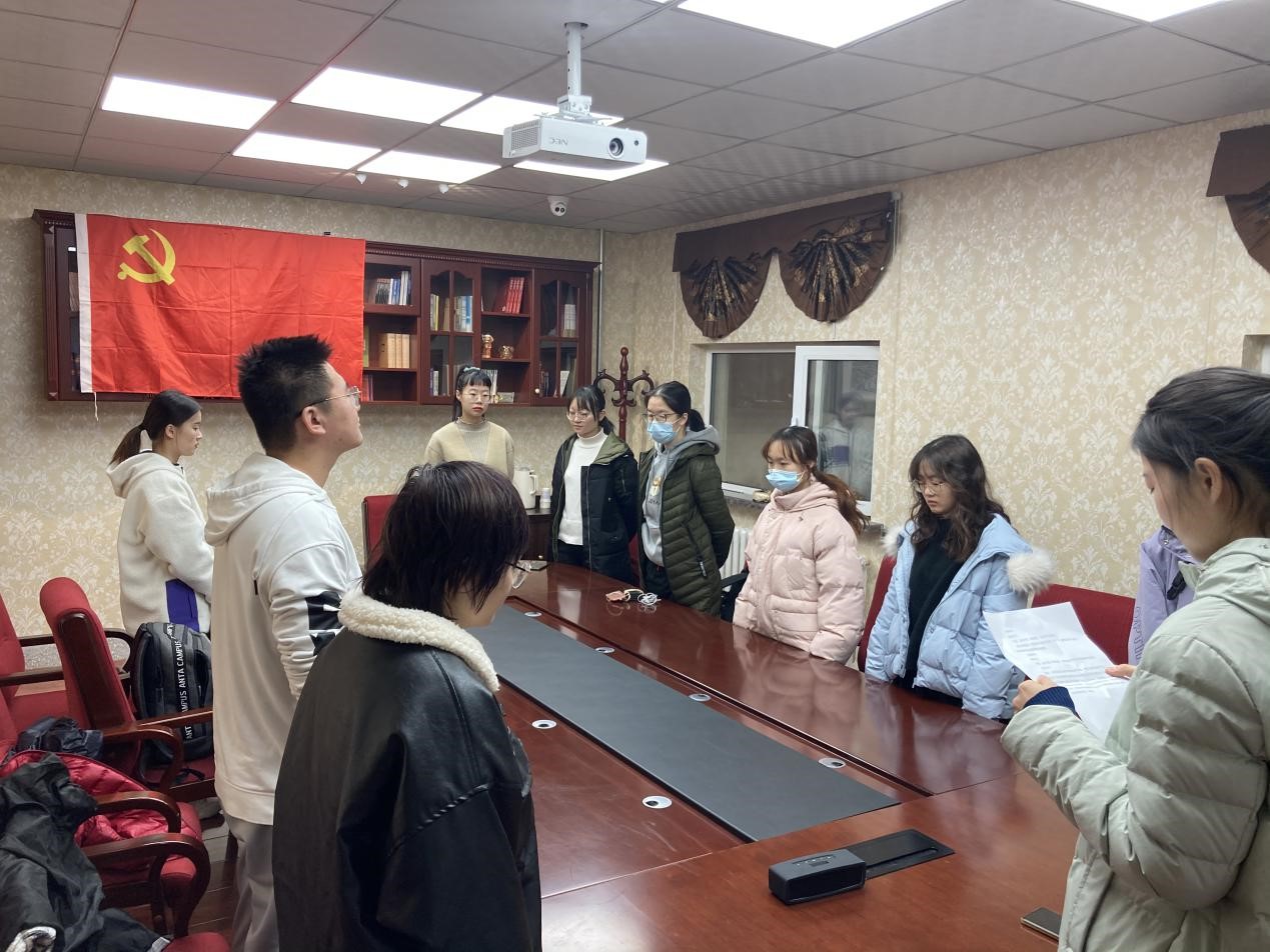 之后,開始播放國際歌,全體黨員起立,對(duì)黨旗行注目禮,播放完畢后,李明軒同志代表全體轉(zhuǎn)正黨員宣讀入黨誓詞。