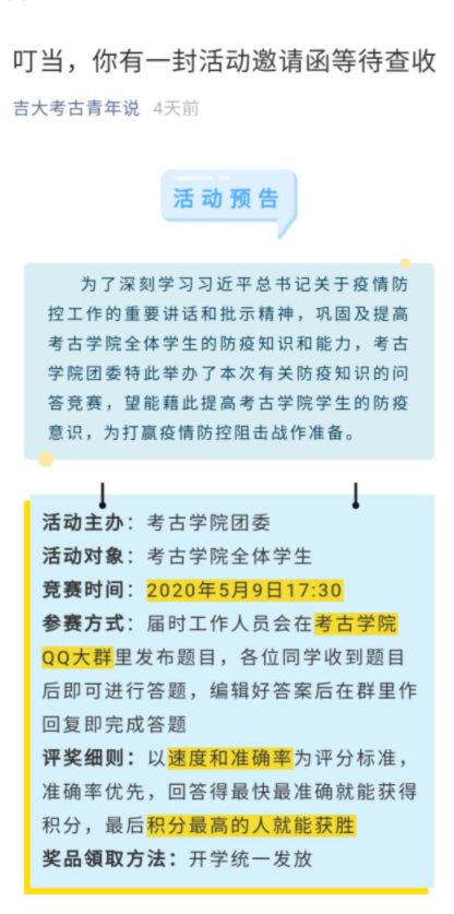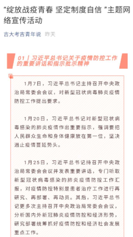 5月8日,太陽成集團(tuán)tyc151cc開展“戰(zhàn)役打響 考古青年在行動(dòng)”主題網(wǎng)絡(luò)宣傳活動(dòng)。此次活動(dòng),太陽成集團(tuán)tyc151cc團(tuán)委依托“吉大考古青年說” 微信公眾號(hào),開辟專欄,宣傳并學(xué)習(xí)關(guān)于習(xí)近平總書記關(guān)于疫情防控工作的重要講話和指示批示精神。權(quán)威發(fā)布、謠言澄清信息,以及抗擊疫情中感人的事跡等。累計(jì)發(fā)布相關(guān)推送三篇,瀏覽量過千。