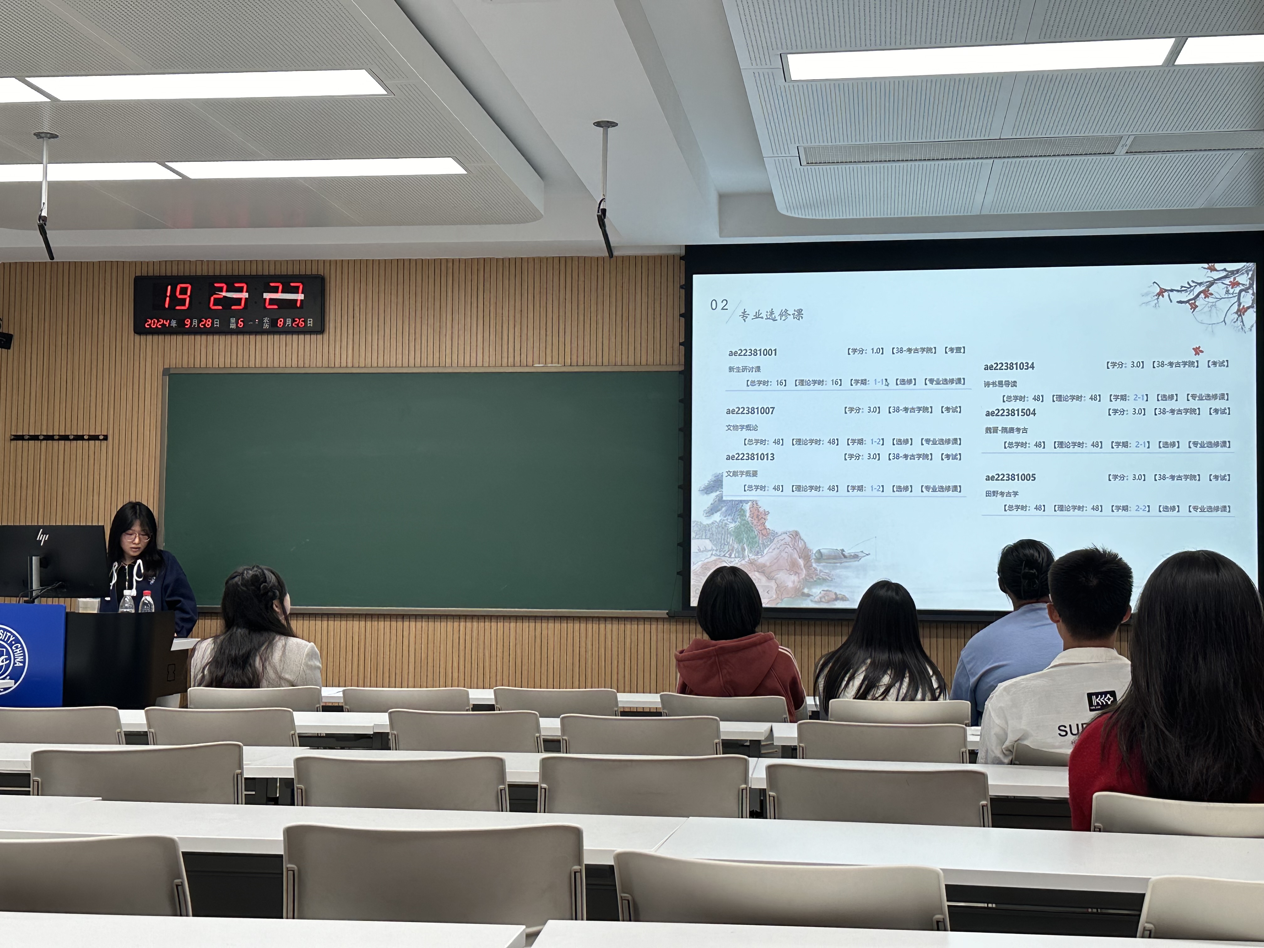 接著,王玥馨同學(xué)從課程相關(guān)、學(xué)習(xí)經(jīng)驗(yàn)及校園生活三個(gè)方面與新生們進(jìn)行分享。王玥馨同學(xué)詳細(xì)地介紹了各學(xué)年的課程安排,提醒同學(xué)們要提高對(duì)思政和計(jì)算機(jī)類課程的重視度。她從個(gè)人經(jīng)驗(yàn)出發(fā),分享了提高學(xué)習(xí)效率的筆記整理和文獻(xiàn)閱讀方法,鼓勵(lì)同學(xué)們積極探索課余生活。最后,她細(xì)致耐心地回答了同學(xué)們提出的問(wèn)題,并希望師弟師妹們帶著純粹可貴的熱情投入到未來(lái)的學(xué)習(xí)生活中。王玥馨同學(xué)細(xì)致專業(yè)的分享使同學(xué)們受益匪淺。