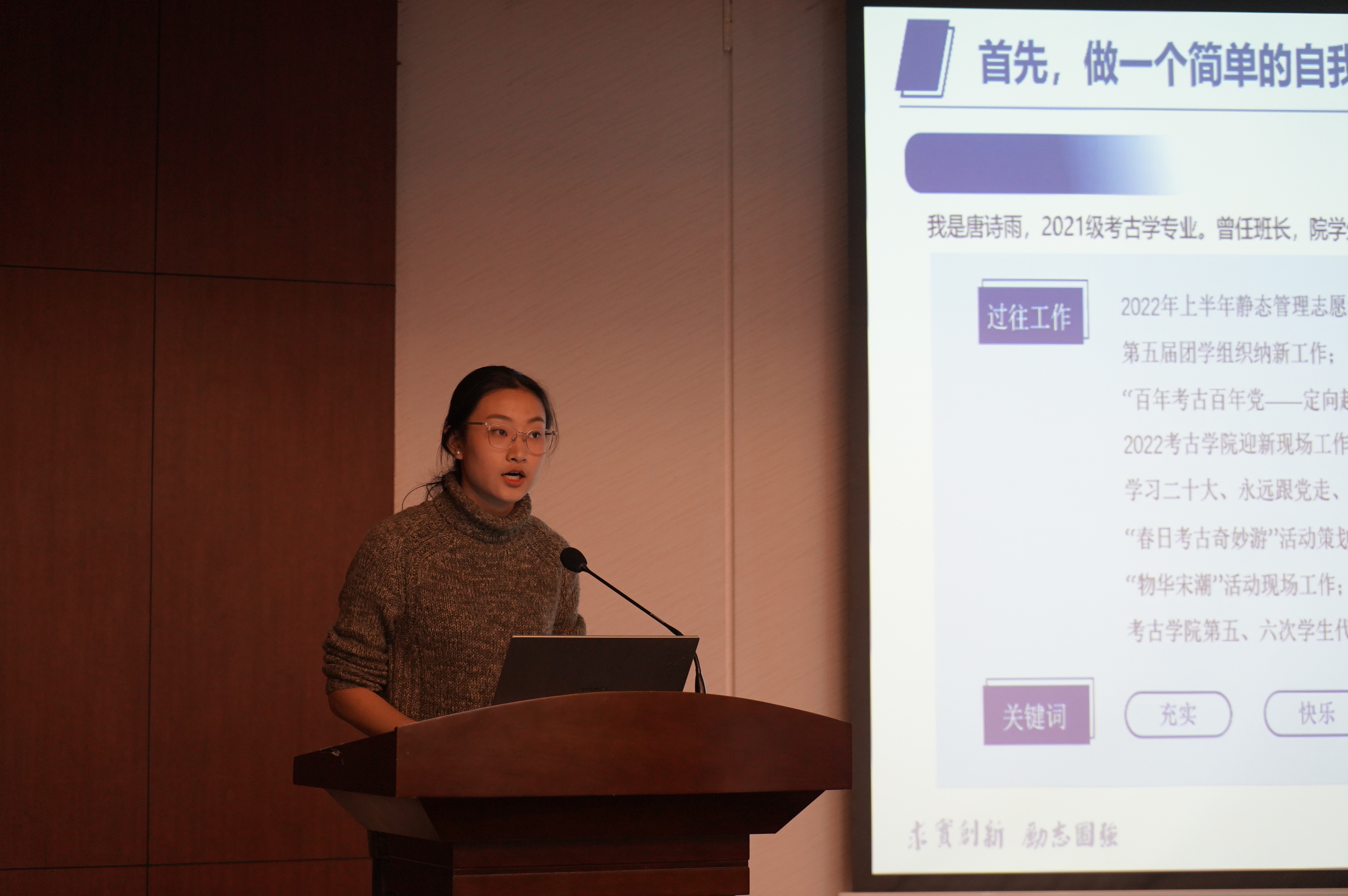 接著,2021級文博班楊芝卿在分享中提出“晴耕雨讀,踔厲奮發(fā)”八字守則,以學(xué)生活動和社會實踐為主線,從重要性、組織活動流程、學(xué)生活動與社會實踐相結(jié)合三方面進行分享,并以首個自己獨立策劃的活動“春日考古奇妙游——公眾考古文化節(jié)”為案例進行剖析。在社會實踐方面,她向同學(xué)們推薦了“中國青年志愿者”公眾號及“到夢空間”系統(tǒng),結(jié)合現(xiàn)實案例鼓勵同學(xué)們積極參與社會實踐,提升自我綜合素質(zhì)。最后,楊芝卿鼓勵同學(xué)們勇敢嘗試,用心投入,學(xué)會反思,珍惜時光。