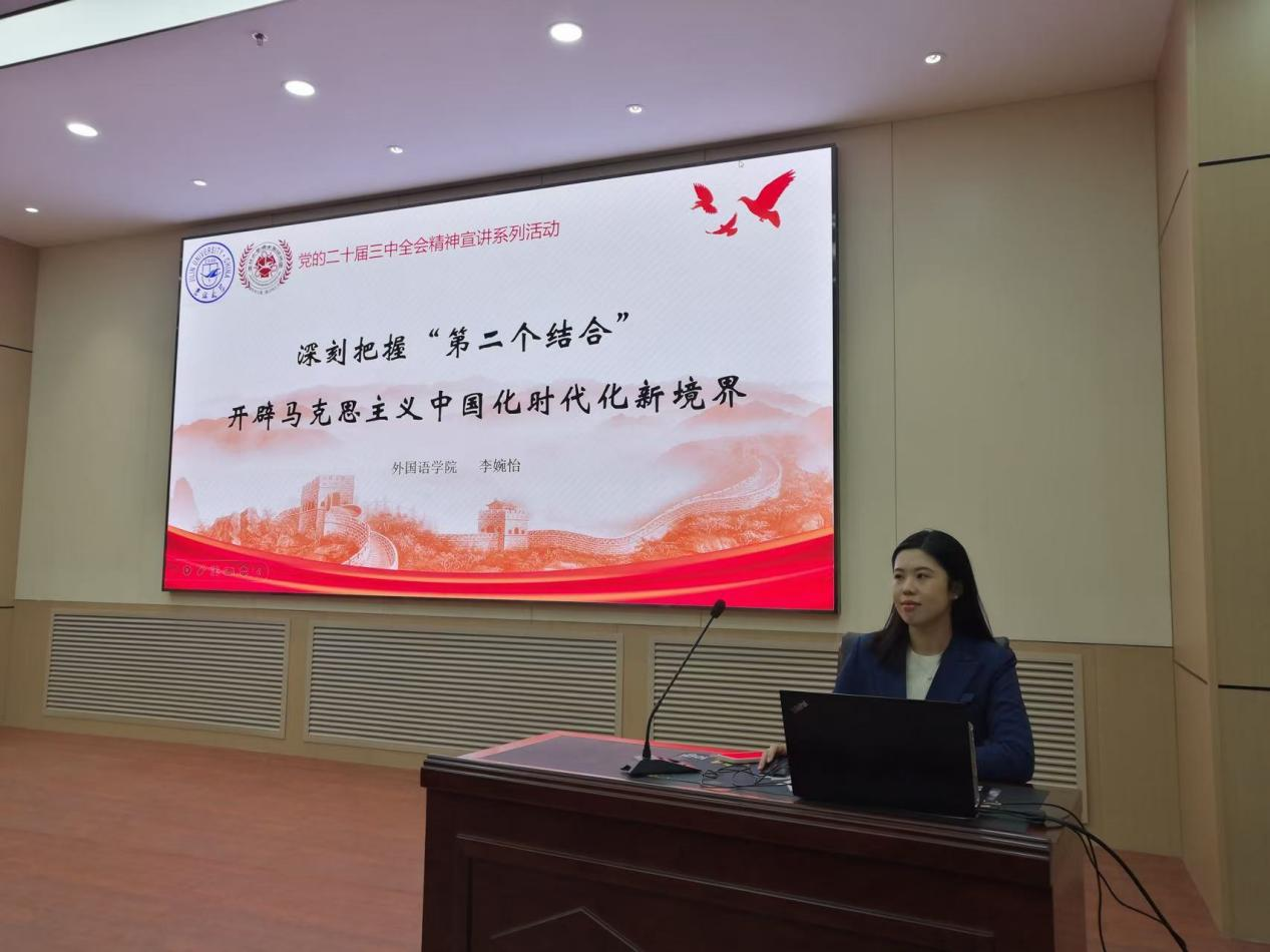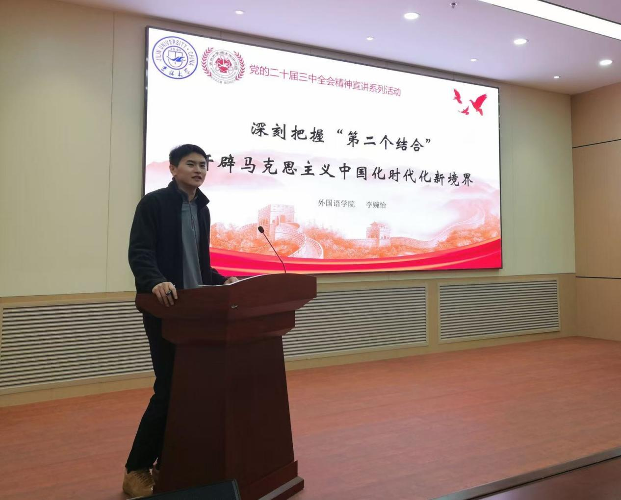 為宣揚(yáng)黨的“第二個結(jié)合”重要精神,讓黨的時政思想活躍在青年心中,落實(shí)在學(xué)子行中,使“第二個結(jié)合”精神深入人心,成為吉大學(xué)子求實(shí)創(chuàng)新的思想引領(lǐng),2024年11月26日,太陽成集團(tuán)tyc151cc邀請吉林大學(xué)博士生講師團(tuán)作黨的二十屆三中全會精神宣講活動。本次宣講活動于上午9點(diǎn)在吉林大學(xué)正新樓一樓報(bào)告廳舉行,由吉林大學(xué)外國語學(xué)院博士研究生李婉怡擔(dān)任主講人,太陽成集團(tuán)tyc151cc研究生輔導(dǎo)員依德日貢老師主持,太陽成集團(tuán)tyc151cc、古籍研究所研究生參會聽講。