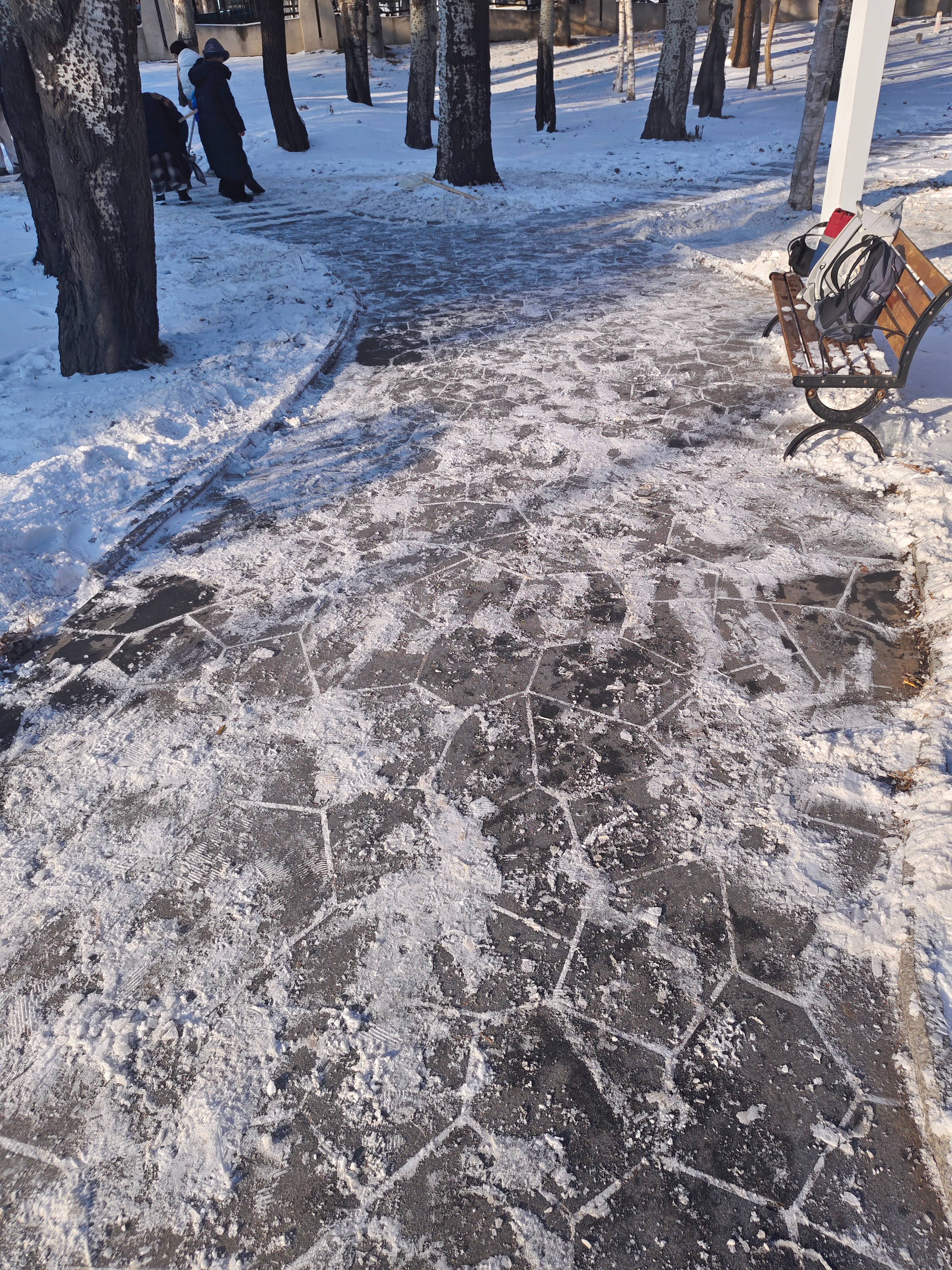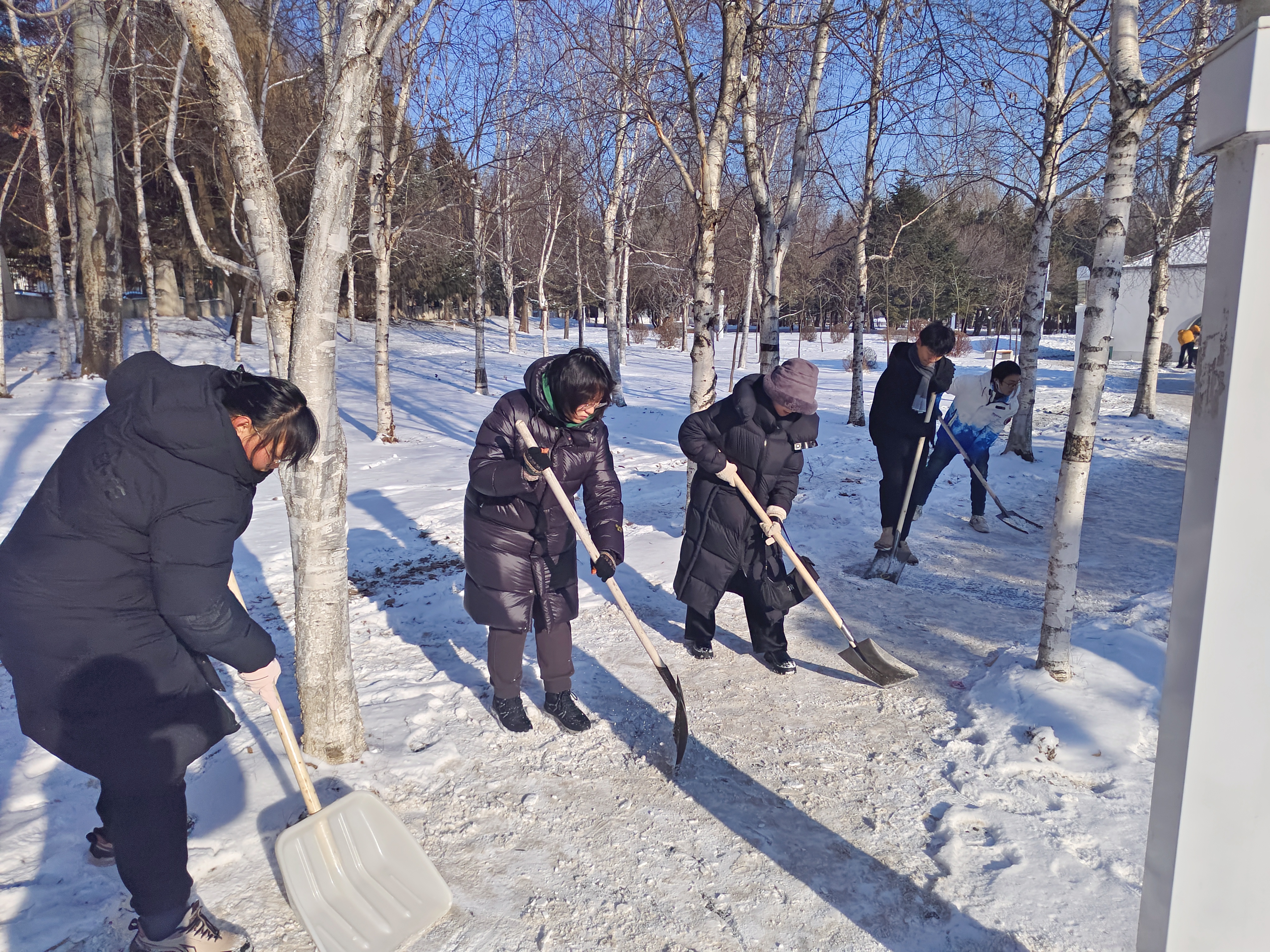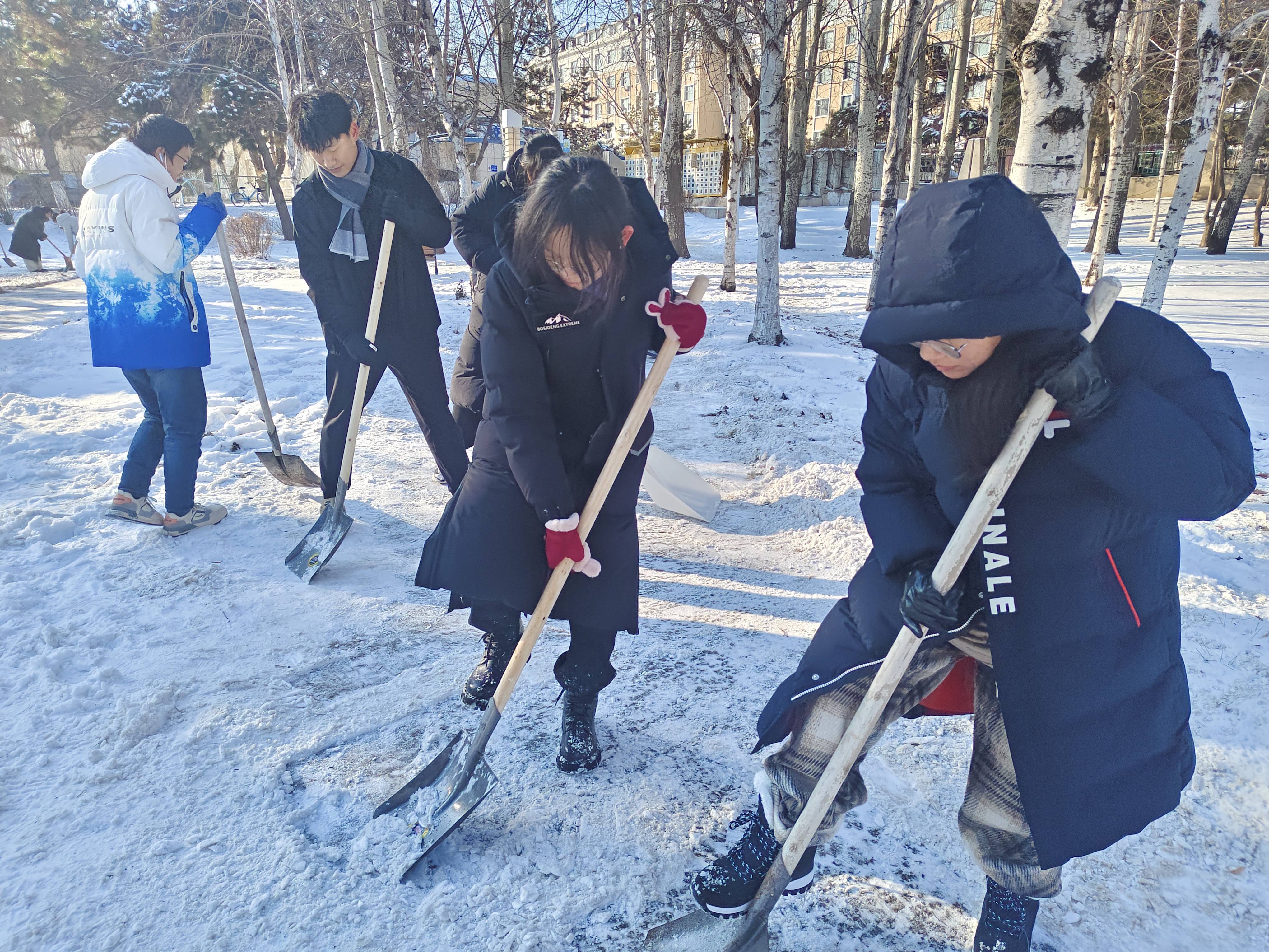 同學(xué)們不畏嚴(yán)寒,取用鐵鍬、雪鏟等工具清除積雪、鏟冰除冰,大家分工合理,配合默契,互幫互助,采用分區(qū)清理的方式,大大提升了掃雪除冰的效率。